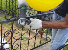 Для начала необходимо зачистить ограду от старой краски. Мы выполняем эту работу механическим путем.